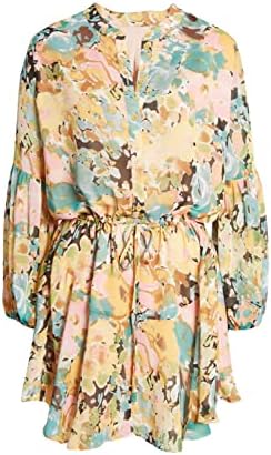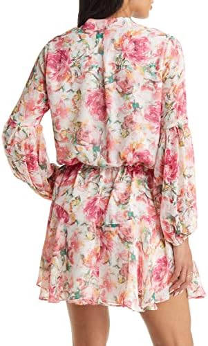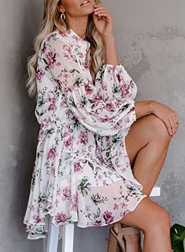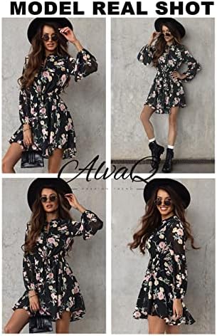 AlvaQ Damen Herbst Sommer Rüschen Laterne Ärmel Knopfleiste Taille Blumendruck Swing Minikleid