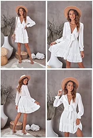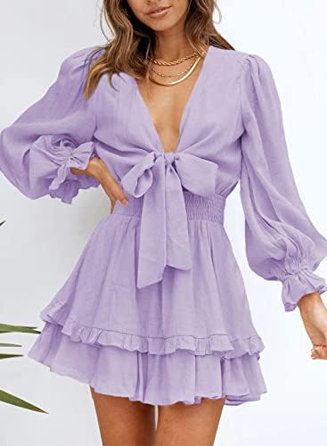 Merkmale: Vintage-Kleid, einfarbig, Blumendruck, sexy tiefer V-Ausschnitt, ausgeschnittenes Knotenband, lange Puffärmel, hohe Taille, A-Linien-Silhouette, kurze Knielänge, lässig, Bohemian, fließendes Strandkleid.