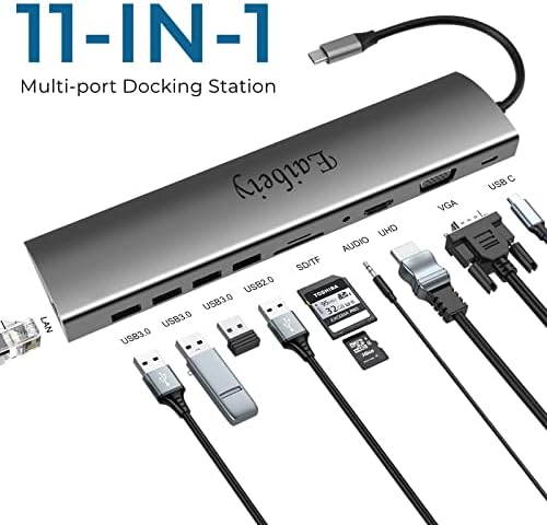 • ?【Eaibeiy 11 in 1 USB C Docking Station】Eaibeiy USB C hub multiple adapter organizes more powerful functions to meet more expansion needs. Plug and Play, no drivers required. The 11-in-1 USB C Docking Station with 4K@30Hz 2xHDMI, 1080@60Hz VGA, Max 10 Gbps 2xUSB-A 3.0 Ports/USB-C 3.0 Ports, Support 10/100/1000M Gigabit Ethernet, Support 2 cards reading simultaneously SD/TF Card Reader, 3.5mm Audio/Mic, and Up to 100W Type-C Power Delivery charging port.