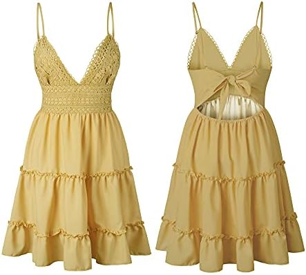 ECOWISH Womens V-Neck Spaghetti Strap Bowknot Backless Sleeveless Lace Mini Swing Skater Dress