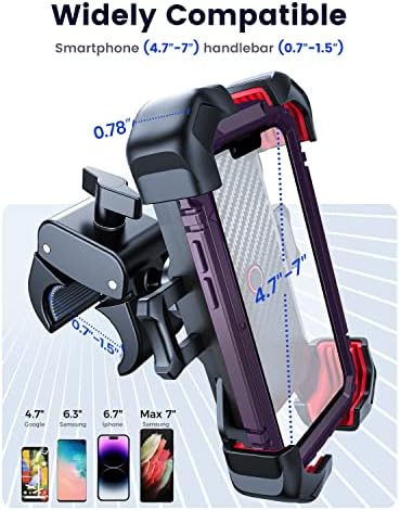 ?[Wide Compatibility] The bike phone holder is compatible with handlebar from 0.7” to 1.34”, you can use it on your ATV, scooter, stroller, peloton, etc. Cellphone from 4.7” to 7”, thickness (with case)≤0.71”, support iPhone,Samsung, LG, Google Pixel,Motorola,One Plus, etc. (Note: Iphone 13 pro max with otterbox case is not compatible).