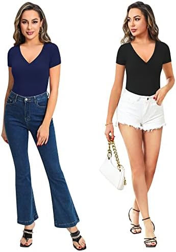 MANGOPOP Bodysuit for Women Modal V Neck Folded Over Short Sleeve Tops Jumpsuit
