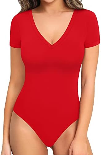 MANGOPOP Bodysuit for Women Modal V Neck Folded Over Short Sleeve Tops Jumpsuit
