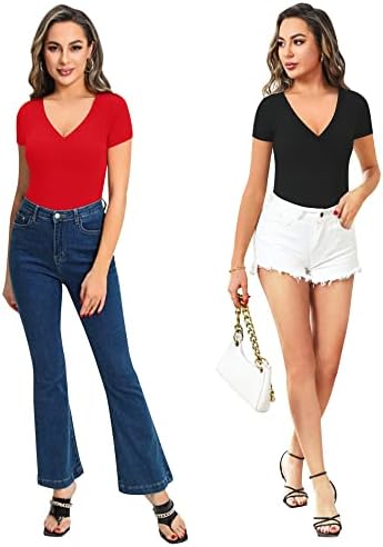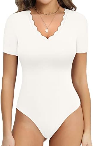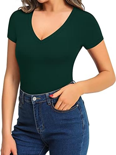 MANGOPOP Bodysuit for Women Modal V Neck Folded Over Short Sleeve Tops Jumpsuit