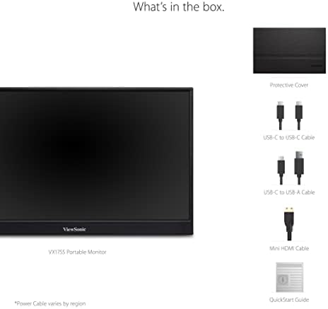 • INCLUDED IN THE BOX: Portable Monitor with Cover, USB C to USB C Cable, USB C to USB A Cable, Mini HDMI Cable, Power Adapter