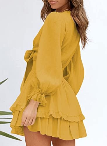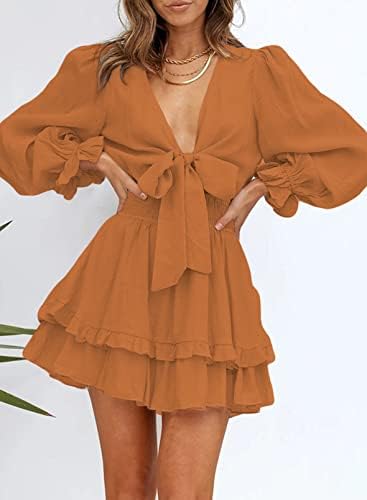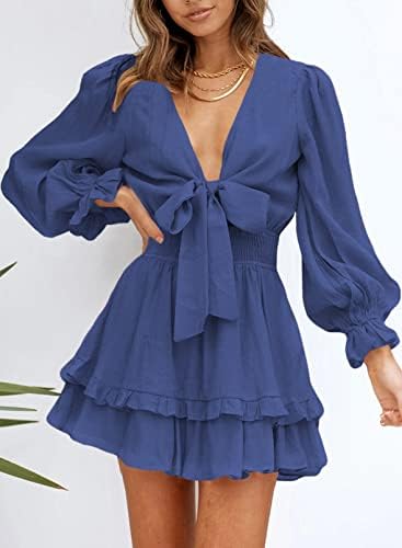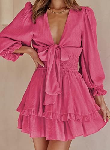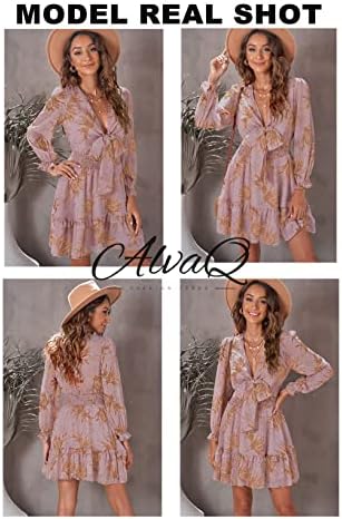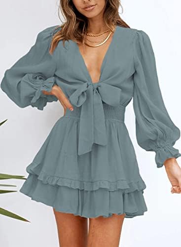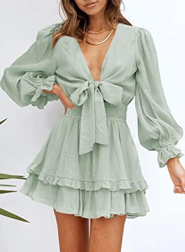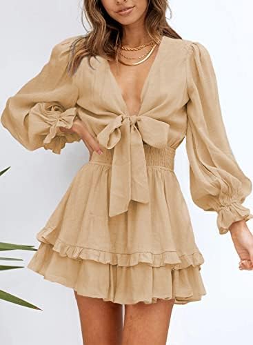 Merkmale: Vintage-Kleid, einfarbig, Blumendruck, sexy tiefer V-Ausschnitt, ausgeschnittenes Knotenband, lange Puffärmel, hohe Taille, A-Linien-Silhouette, kurze Knielänge, lässig, Bohemian, fließendes Strandkleid.