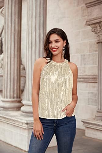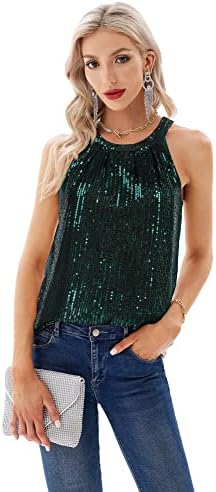 【Features】Dressy sequin, Ruched halter tops, Sleeveless, Pull on closure, Light stretch, Sequine front, Polyester back, Bling glitter shimmer, Loose fit.
