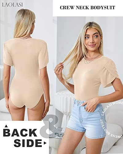 LAOLASI Women's Petal Short Sleeve Bodysuit Crew Neck Slim Fit Casual Stretchy Body suit T Shirts